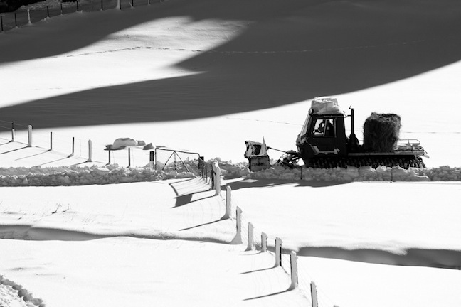 This bloke happened to have an old ex-resort Piston Bully lying around at his farm, here he is driving a bale of hay up to a stranded mob of Merino sheep, he was nice enough to give us a ride up the hill on the back. Image:: Nick Johnson