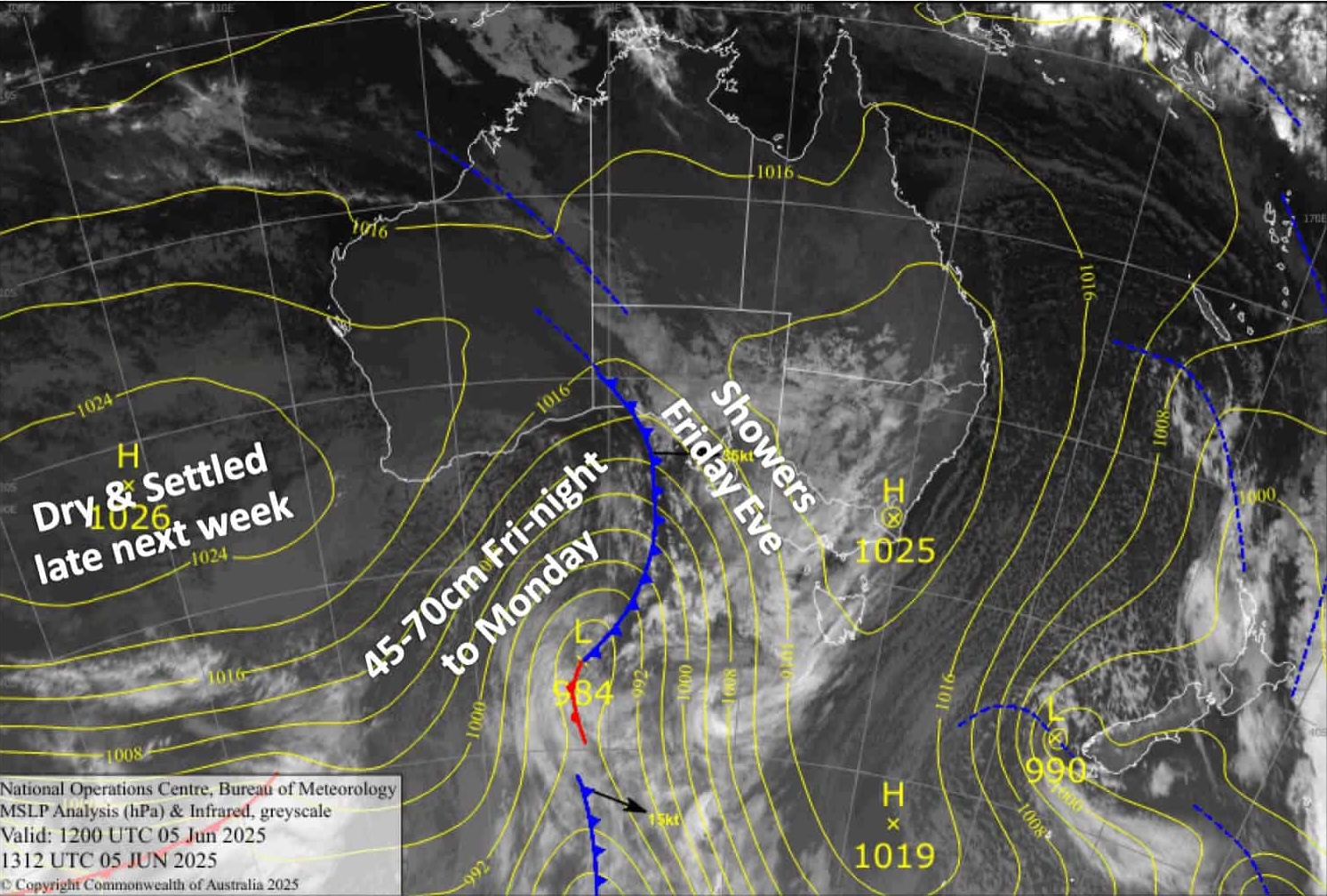 A weak cold front at the start of July brought a moist southeast air flow and a few centimetres of high elevation snow but rain down low, Baw Baw receiving 54mm on July 2nd. That was followed by clear but relatively warm weather with minimal snowmaking opportunities and gusty pre-frontal NW winds with a couple of cold front on the way..