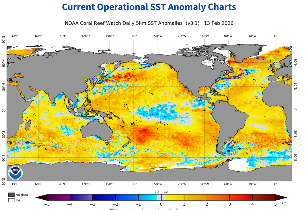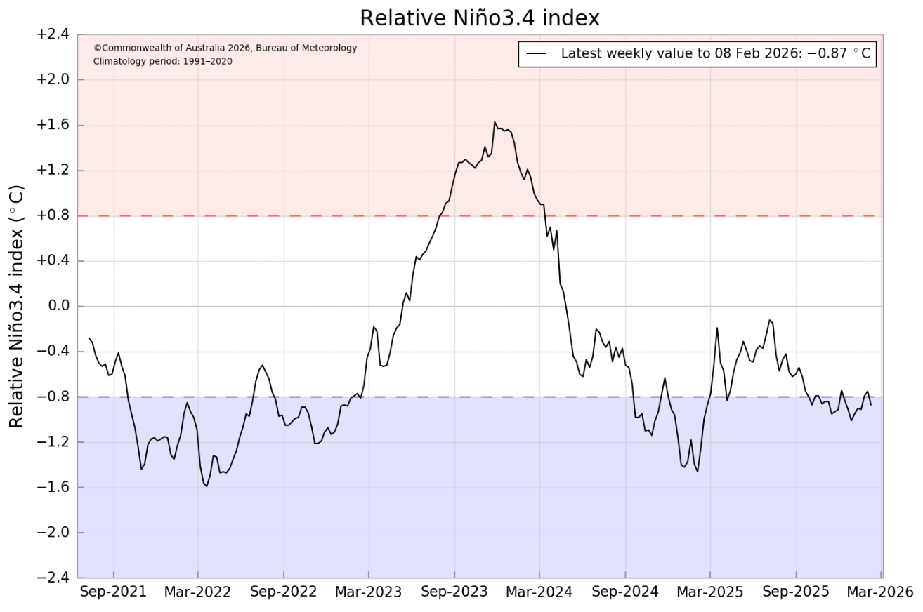 Now to analyse where we are at, let’s start with the oceans. The below graphic of the global SST anomaly shows a cooler anomaly in the central-eastern equatorial Pacific that is slightly more subdued than what we have seen earlier this season. If we cast our minds back to previous updates this was part of the plan, with a weakening La Nina over the February-March window the most likely scenario.