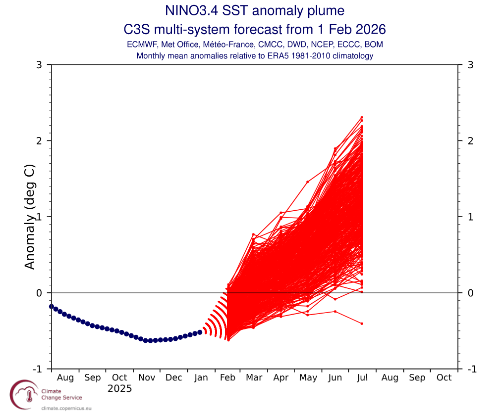 Supporting our idea of ENSO returning to neutral values we can look at the most recent forecast. Below is a product featured in past updates showing an ensemble spread of possible future paths of ENSO over the coming months based on model data from many of the leading met agencies worldwide. From February we can see the models are only really going in one direction, back to neutral and the potential for a strong swing into El Nino territory at the end of the year (which is not uncommon after a La Nina event). The focus here is on the next few months heading into spring with looking any further into the crystal ball on the other side of spring known to be particularly difficult to predict.