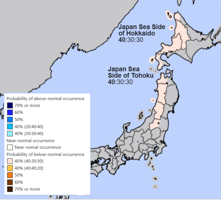 The three-monthly snowfall outlook for February through April from JMA showing a slight leaning towards below average snowfalls across the Sea of Japan side of Tohoku and Hokkaido. Source: JMA.