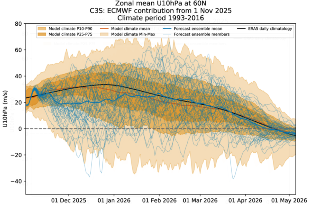 The chart below shows the forecasted zonal (east/west) wind strength in the upper atmosphere at 60 degrees north from the ECMWF model, which we can treat as a proxy for the polar vortex strength. The bold blue line shows the mean forecast this winter which is noticeably lower than the expected climatology through until the second half of winter.