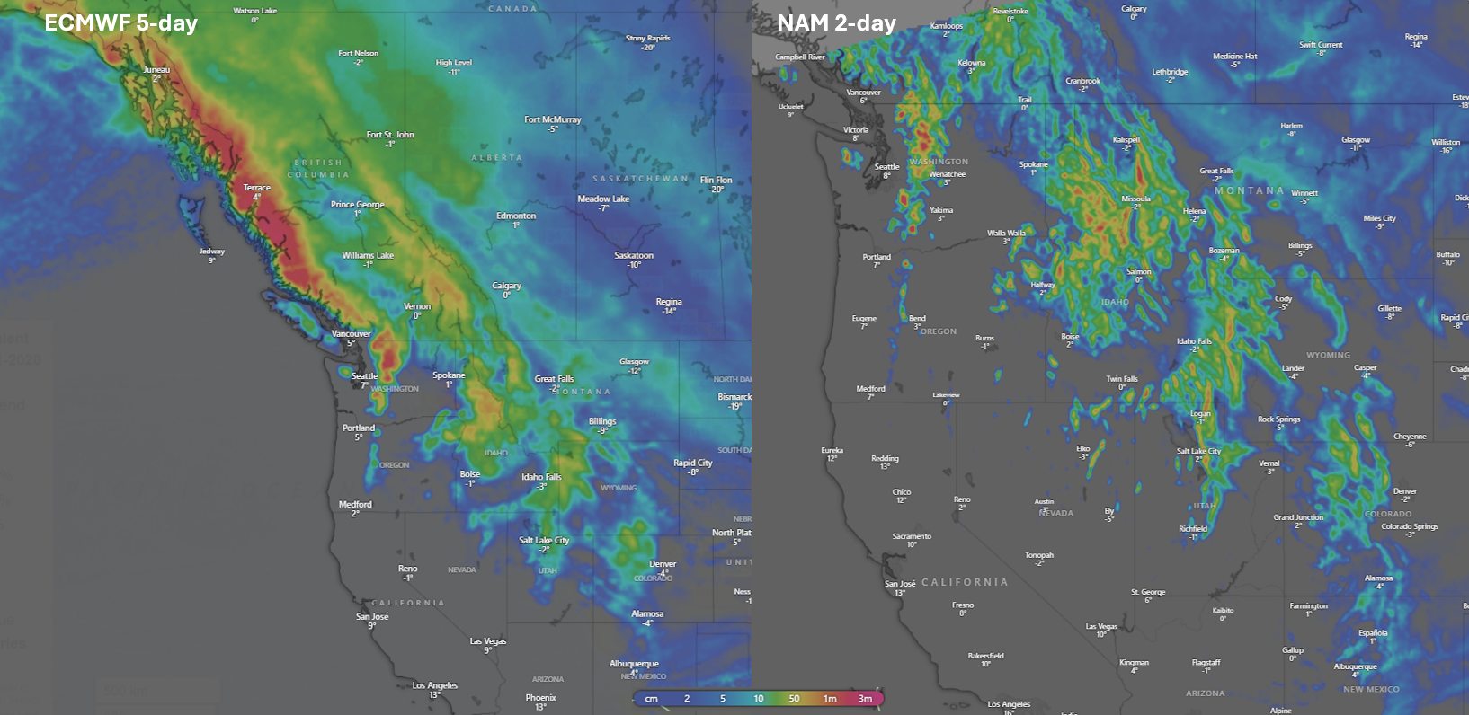 To quickly touch on the short term the good news is there is some snow on the way over the next few days, which is a welcome sign but unfortunately it does seem to miss certain areas. Below is a forecast snow accumulation map for the ECMWF model (widely considered one of the best) and the NAM model (a higher resolution model tuned for the most populated areas of North America). The map on the left shows the snow accumulations for the next 5 days while the right shows the accumulations for the next two days. They have similar patterns and BC’s Coast Mountains, the Canadian Rockies and areas like Montana/Idaho/Wyoming are well-placed as a trough orients itself through that corridor. It moves through further into the US with some snow also for Utah and Colorado areas. Unfortunately, a high-pressure system over California which will gradually weaken into a ridge deflects the storm system away from areas like Tahoe and the Sierras which will ultimately see settled conditions.