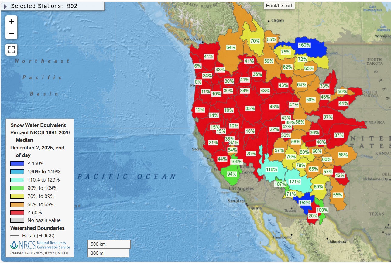 As mentioned, an extended dry spell in the west throughout some of the popular ski areas of the United States has been leaving many wanting. Below is a map of the snow water equivalent for many basins around the western United States. It colour codes that basin’s current measurements against the median value for that specific day from the 1991-2020 period. We can see a lot more reds than desired, but it is the first week of winter and one decent storm could change the complexion of this map dramatically.