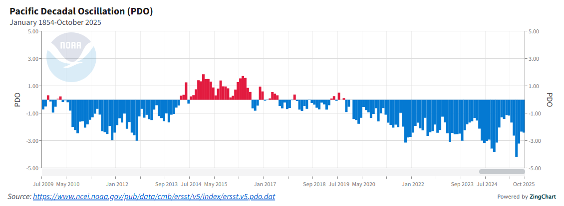 An interesting note during our Pacific focus is the state of the Pacific Decadal Oscillation (PDO). The PDO can be thought of as a longer-term state of the Pacific with variability on a more decadal than interannual. It is of use to us because during a negative PDO phase there is an increased tendency for La Niña events to occur and the PDO can amplify ENSO when the two are in phase (e.g. both positive or both negative). The graph below shows an index that tracks the PDO, we see a negative shift in the last five to eight years which most recently in July this year reached the most negative values ever recorded. This background negative Pacific signal can act to help reinforce the typical conditions of a La Niña, and those typical conditions are what we are going to investigate next.