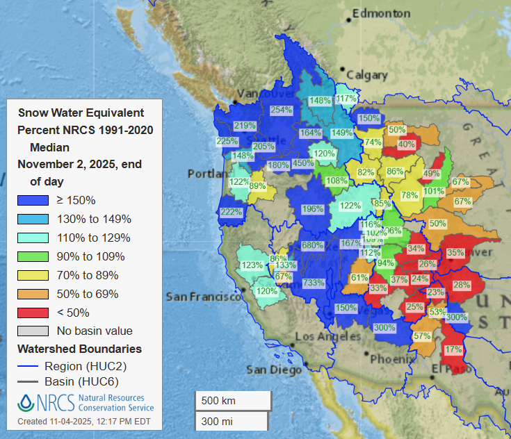 Below is a map of snow water equivalent (SWE) levels in basins across the western United States which shows their percentage of ‘normal’ (the median from the 1991-2020 period for that basin). We can see a solid beginning for areas further west and this map becomes more indicative of the snow performance further into winter. However, for now it gives us a hint about a solid start especially in the northwest, which is expected for reasons we will go through below.