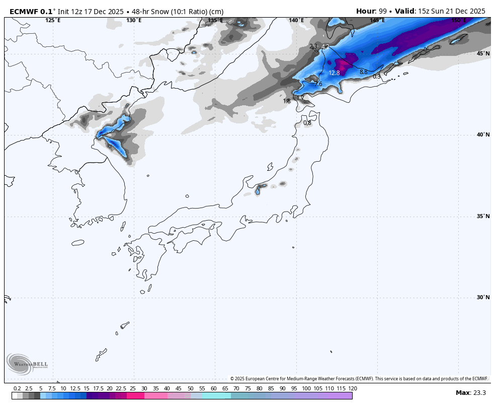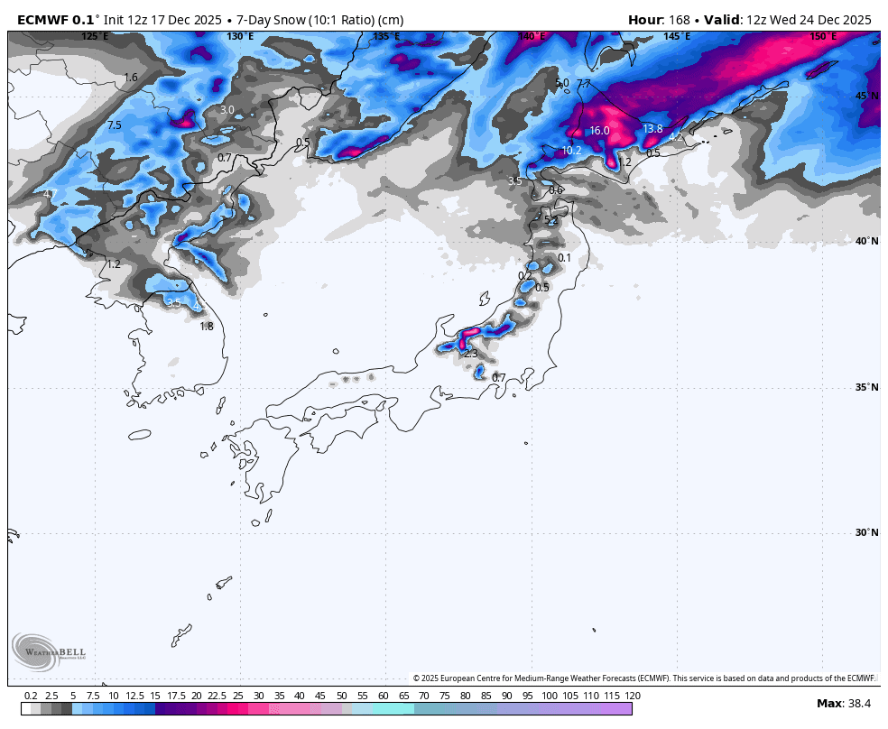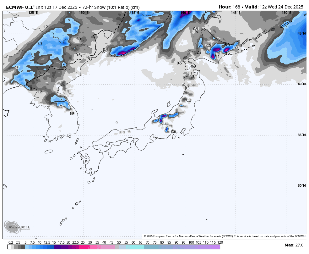 7-Day snowfall accumulation. Note that snow depths here are calculated using a 10:1 ratio, where 1mm of rain equals 1cm of snow. This can significantly underestimate things here in Japan, where 1mm of rain often equates to 1.5-2cm of snow owing to its light n’ fluffy nature. Source: ECMWF, Windy.com