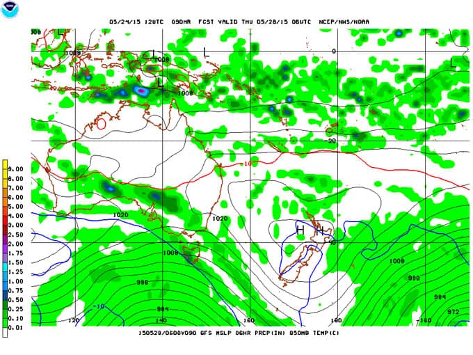By Wednesday that high is slipping eastwards into the Tasman Sea, and by Thursday a north-west airstream is generating rain.