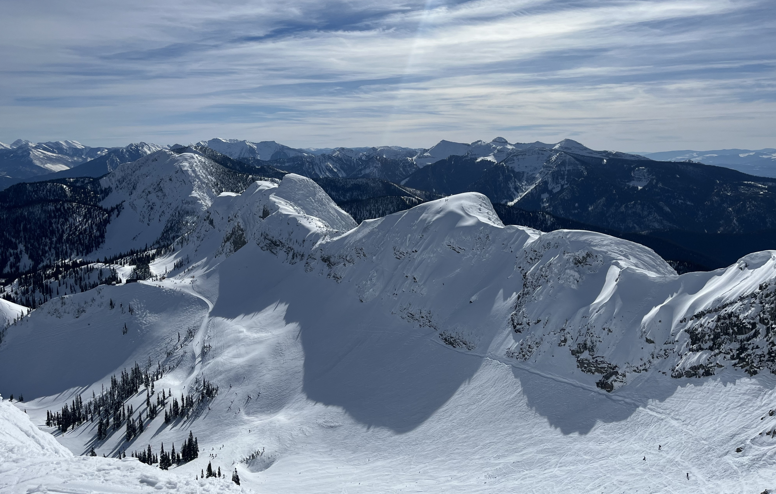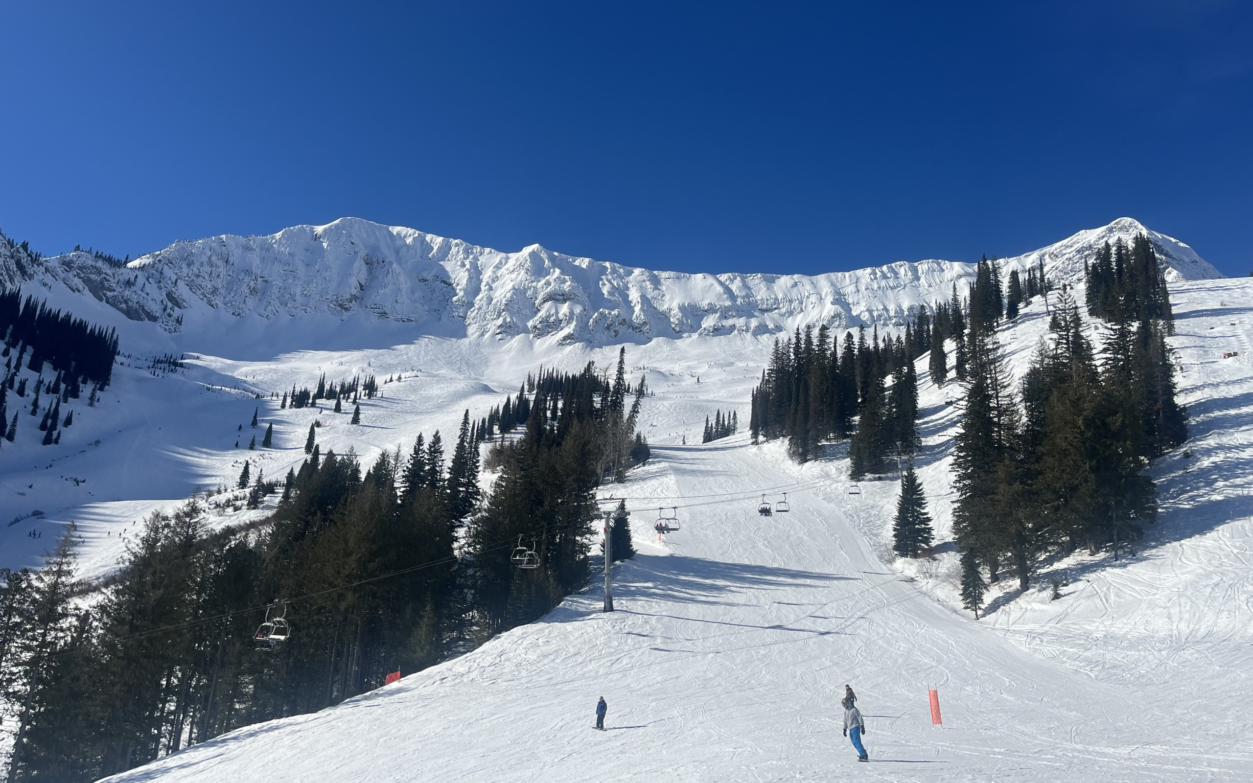 We were staying on mountain at the ski-in ski-out Lizard Creek Lodge, with easy access for first lifts. We had fine weather for the first three days, spring-like with mild temps and a melt-freeze cycle on the lower mountain, so we stayed up high each morning, using the Timber Bowl Express quad chair to access the higher terrain.
