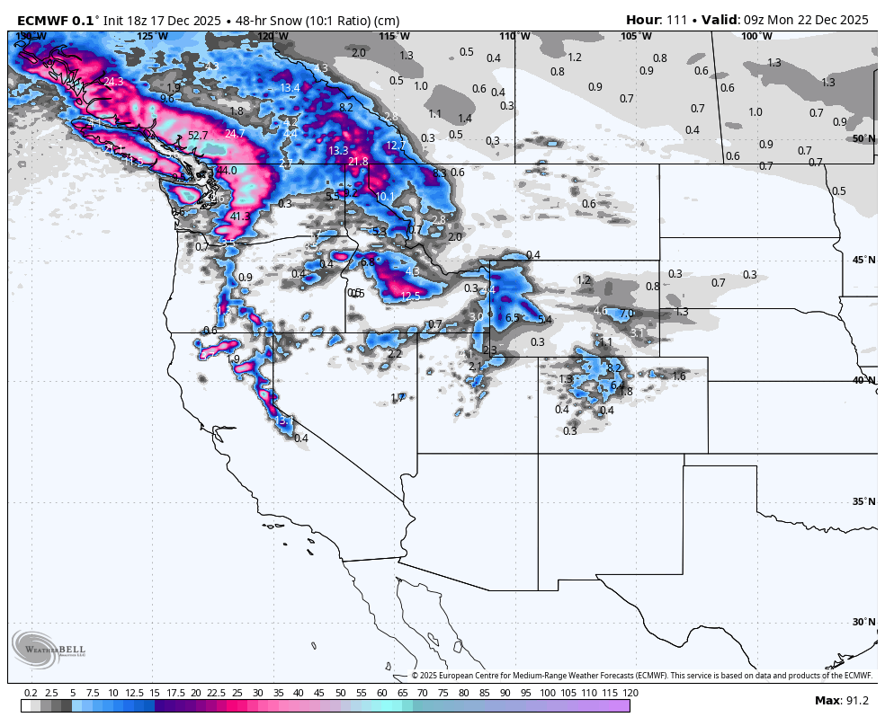 Then on Wednesday, Christmas Eve, models expect the AR to strengthen and expand northward into the Cascades and southward into the Southern Sierras. Precipitation rates could be off-the-chart heavy, and there is a hint temperatures will be a little colder too, so snow levels could creep closer to the lower slopes if we’re lucky. Over the three days, snow accumulation in the Sierras could approach or exceed 1.5m above snow levels. From zero to hero!