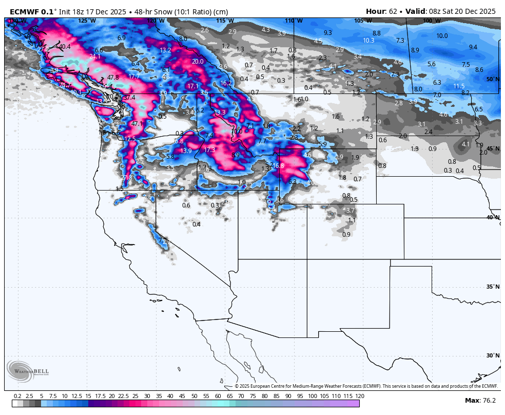 In the lead-up to Christmas, synoptic charts will be a tangle of fronts and low-pressure systems as the storm cycle remains active across much of the west. Resorts in Canada and the northern US will do well with consistent light to moderate snowfall and cooler temperatures.