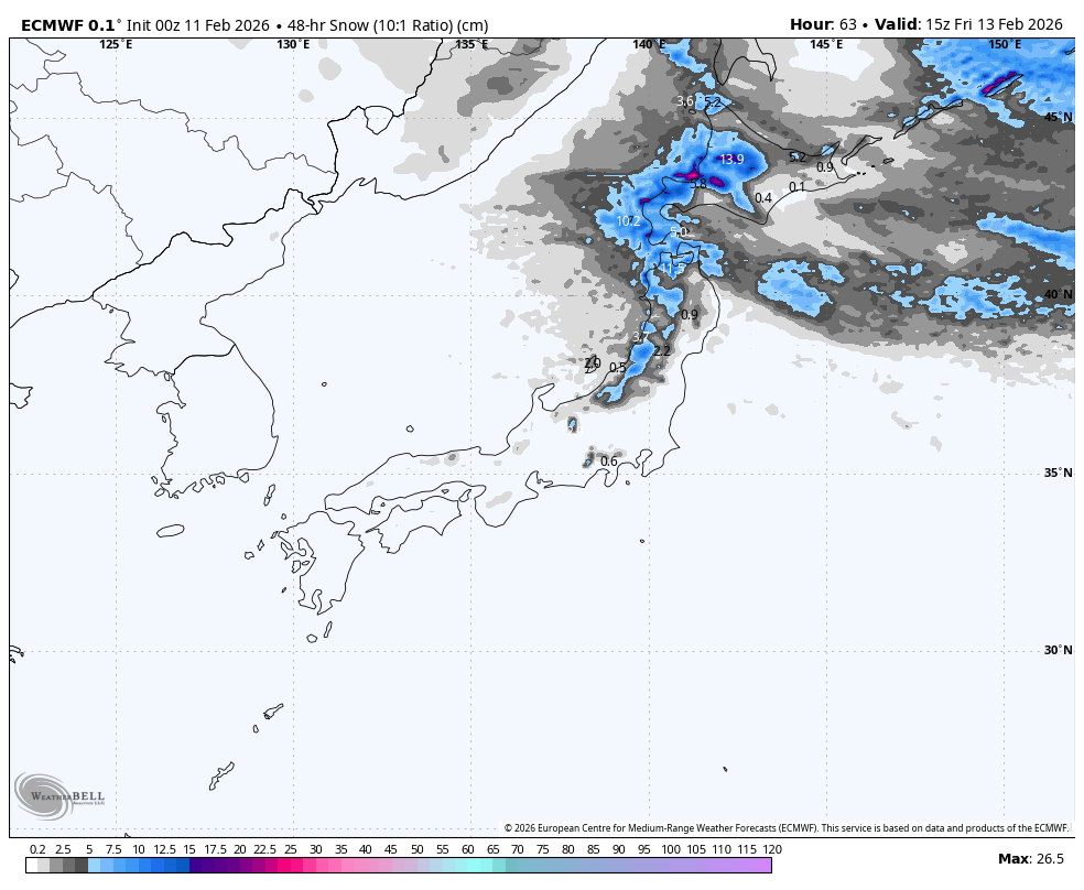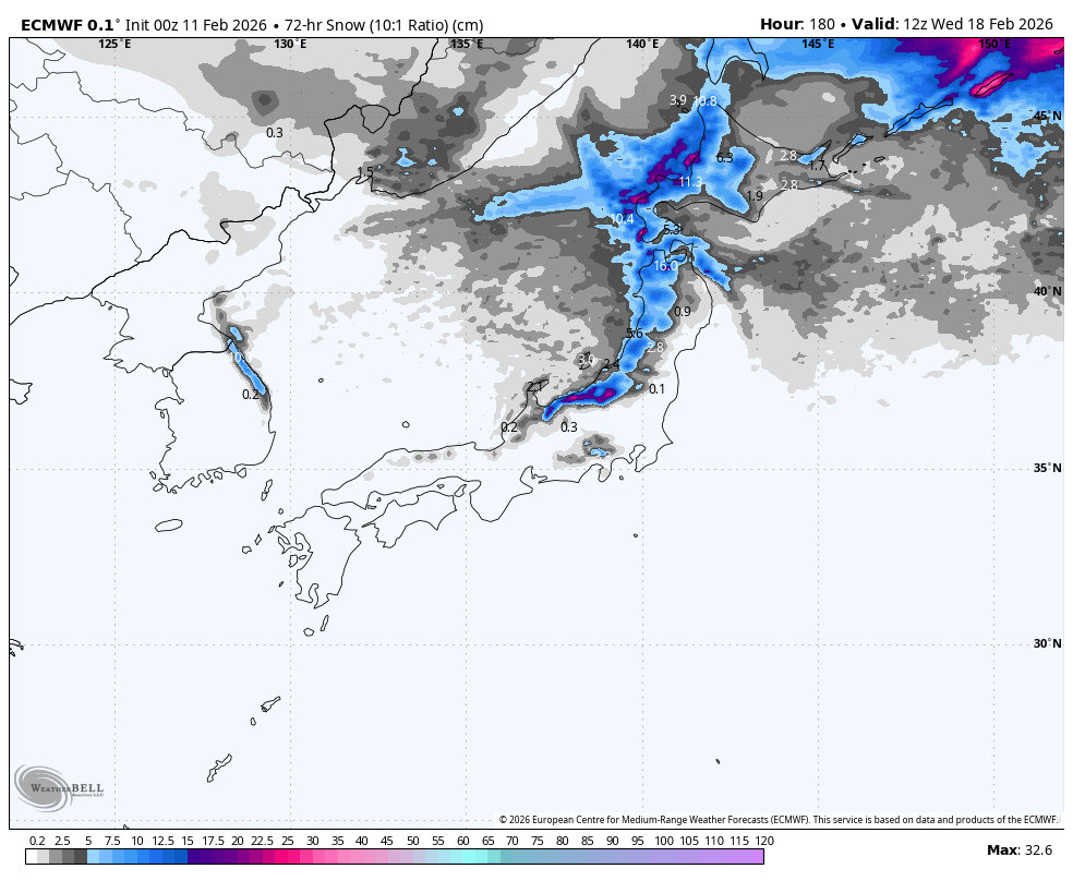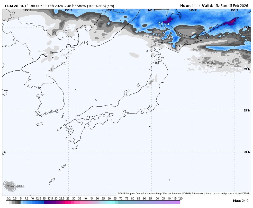 Honshu will have sunny skies throughout the weekend, and remaining light snow showers on Hokkaido will clear Saturday morning. A mix of rain and snow develops over Hokkaido early Sunday as a low approaches, but a cold front will hit Sunday night, bringing light to moderate snowfall down to sea level. The cold front continues south over Honshu overnight Sunday, kicking off the first half-decent snowfall there in 3-4 days.